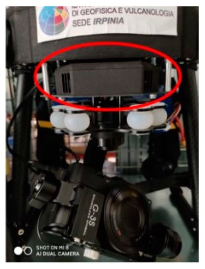 The take-off drone weight is 6 kg and has an autonomy of about 27 min. The UAV includes a 3-axis Gimbal Brushless with an approximate weight of 500 g as support for the camera. The UAV is equipped with a Camera Sony RX100 m2, based on 1” Exmor CMOS sensor (13.2 mm × 8.8 mm) and ZEISS® Vario-Sonnar T* F1.8 lens with 3.6 × optical zoom. The platform is equipped with a second compact single-GNSS receiver (Reach M+ that was used in PPK mode) as highlighted in Figure 4, with the aim to log the raw data in the UBX format using GPS and GLONASS satellites [,].