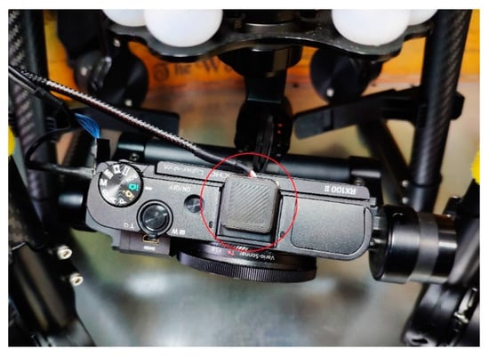 We used a “Tallysman TW4721” antenna, covering GPS/QZSS L1, GLONASS G1, Galileo E1, BeiDou B1 as well as SBAS (WAAS/EGNOS/MSAS) [,]. The default GNSS instrumentation mounted on a UAV was inserted with the aim of helping the navigation of the aircraft and does not have the ability to provide support for the georeferencing of images. This problem was bypassed by connecting the camera and the GNSS receiver, as shown in Figure 5, so that with each click of the camera a trigger is sent to the receiver, which records the time and coordinates with a maximum delay of one microsecond.