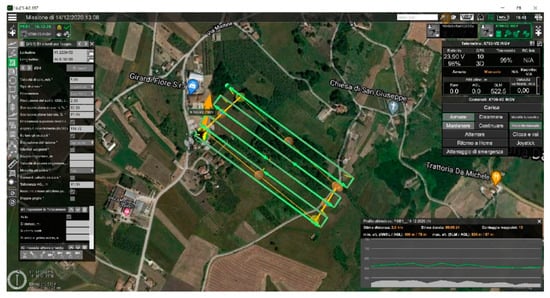 A photogrammetric mission was planned with these parameters: flight speed 5 m/s, GSD 2 cm, Overlap 80% and Sidelap 70%, as shown in Figure 7.