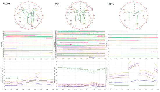 The goodness of the GNSS data collected was verified, both as positions and as raw data and for both the Rover and the Bases. In particular, the RTKLIB [,] software was used for the QC (Quality Check) of the three different bases. For each acquisition, a satellite visibility analysis was carried out with the creation of Skyplot, Visibility Chart and SA/DOP (Satellite Availability/Dilution Of Precision). Figure 9 shows the charts of the L1/Lc Skyplot, visibility and Satellite Availability/Dilution of Precision for all 3 bases (RS2, ALLOY and RING).