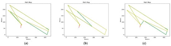 (a) Drone route maps with Alloy PPK correction; (b) Drone route maps with RS2 PPK correction; (c) Drone route maps with RING PPK correction.