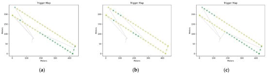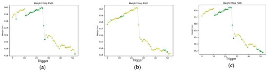 (a) Heights/Trigger drone maps with Alloy PPK correction; (b) Heights/Trigger drone maps with RS2 PPK correction; (c) Heights/Trigger drone maps with RING PPK correction.