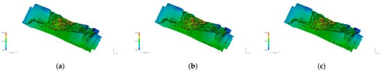 (a) DEM processed with Alloy PPK correction; (b) DEM processed with RS2 PPK correction; (c) DEM processed with RING PPK correction.