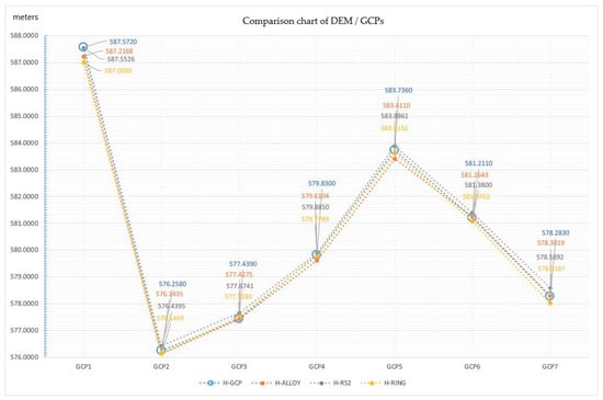 As shown in Figure 15, the altimetric trends of the three PPK elaborations (H-ALLOY, H-RS2, H-RING) were perfectly comparable with the ones produced by RTK analyses of GCPs (H-GCP) and show reduced and acceptable deviations [,,].