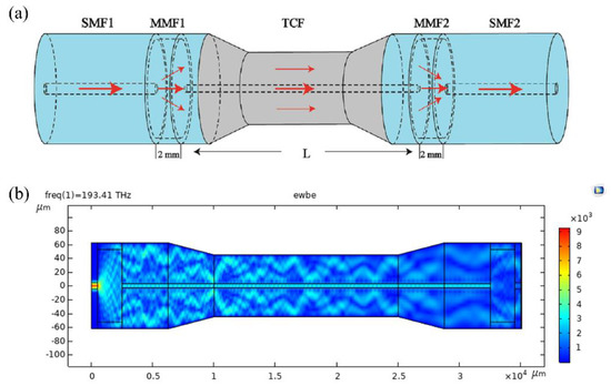 (a) Schematic of the proposed MZI with a multimode-fiber-thin core-fiber-multimode-fiber (MMF-TCF-MMF) structure. (b) Simulated result of the mode field distribution.