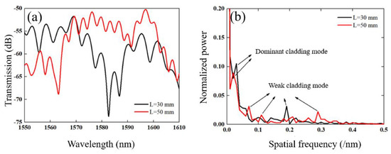 (a) Transmission spectrum of the sensor with different TCF lengths (L = 30 mm, L = 50 mm). (b) Spatial frequency of fiber fusion based MZI sensor with different lengths.