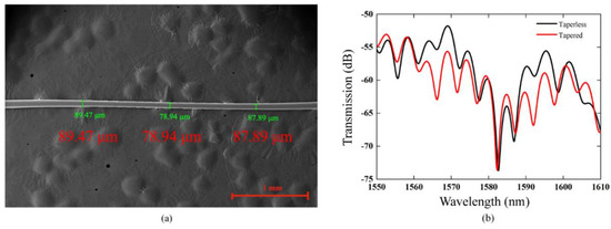 In order to create better coupling into the cladding mode, the TCF is stretched to introduce a taper. The sensing head is fixed on the three-dimensional adjustment frame and the TCF is heated by a torch (PT-220, IRODA, Taiwan) and stretched to obtain a tapered-TCF. Figure 3a shows an SEM image of the TCF after tapering. One can see that the cladding diameter of the tapered TCF has decreased from 125 µm to about 80 µm. The transmission spectrum of the sensor with and without tapering is shown in Figure 3b. After tapered, the contrast ratio increases because the intensity ratio between the core mode and cladding mode varies, meanwhile the dip wavelengths are almost unchanged.