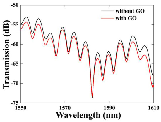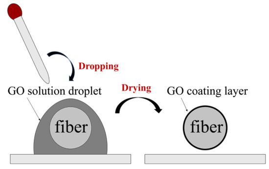 The process of coating GO onto the tapered-TCF is shown in Figure 4. First, a 0.08 mg/mL GO dispersion (XF020, Nanjing XFNANO Materials Tech. Co., Ltd., Nanjing, China) was centrifuged at 10,000 RPM for 15 min to create GO sheets with a size larger than 500 nm. Second, the fiber was cleaned with alcohol several times, and the sensing area was immersed in a sufficient-sized droplet of GO dispersion and was naturally evaporated for 24 h at temperature of 25 °C. As a result, GO adhered to the surface of the fiber, seen in the SEM image (Figure 5). We observe that the GO layer is uniformly attached to the surface of the tapered-TCF and a large number of undulating folds are formed simultaneously. The undulating folds increase the effective surface area of the GO exposed to the gas, which is advantageous for absorption. It should be noted that the thickness of the GO film can be adjusted by controlling the concentration of the GO solution and the immersion time. For comparison, we measured the transmission spectra of the sensor with and without GO (Figure 6). There are no obvious changes except for the contrast, and the GO coating has not affected the interference properties of the sensor.