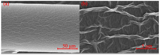 SEM image of the tapered-TCF after coating with GO. Resolution: (a) 50 μm, (b) 5 μm.