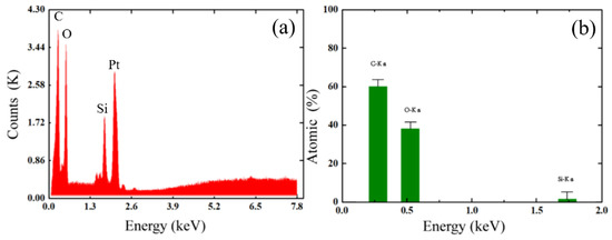 To further determine the elemental composition of the GO coating material on the fiber, we performed an energy dispersive spectroscopy (EDS) analysis, as shown in Figure 7a. The coating material mainly contains the elements C, O, Si and Pt; Si is a component of the optical fiber, and Pt was sprayed on to obtain the EDS image. Figure 7b shows the atomic composition of each major element of the coating material; the specific gravity of the three elements C, O and Si are 59.92, 38.17 and 1.92%, respectively, and the GO coating is without significant impurities. It should be noted that the functional group in the GO contains hydrogen, which does not appear in this EDS elemental analysis.