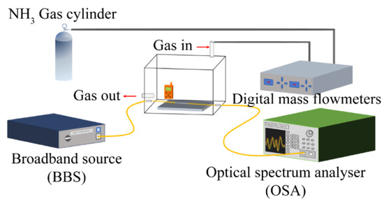The performance of this sensor was investigated using the experimental setup shown in Figure 8. The sensor was placed in a sealed gas chamber. A broadband light source (BBS) (ASE-C+L module, HOYATEK, Shenzhen, China) was used to illuminate the interferometer. The output spectrum was acquired by an optical spectrum analyzer (OSA) (AQ6370B, YOKOGAWA, Tokyo, Japan). The gas chamber was constructed of pure silica and kept sealed; the inlet and outlet ports were gas-tight switched valves. Before injecting ammonia gas, the air chamber was connected with the ventilation unit for one hour to discharge as much water vapor and other impurities as possible from the air chamber and the pipeline. The outlet valve was then closed to ensure that the air in the gas chamber was no longer disturbed by external ambient air. At this time, there was only air in the gas chamber, and the output spectrum was recorded as an initial reference for the NH3 concentration 0 ppm. Subsequently, the mixture of NH3 and N2 in a volume ratio of 5:95 was gradually injected into the gas chamber to mix with the air to get different NH3 concentrations. The main component of air retained in the air chamber is nitrogen gas, and only nitrogen gas follows a trace amount of ammonia gas into the gas chamber. Further, the molar amount of the injected gas is also small due to the low NH3 concentration. So, it can be considered that the change of the transmission spectrum in the experiments is caused by the concentration adjustment of the ammonia gas.