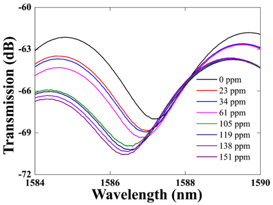 In the experiments, the ammonia gas concentration increased from 0 to 151 ppm. Figure 9 shows the transmission spectra for different concentrations of NH3. The ammonia gas mass flow rate into the chamber was precisely controlled by a digital mass flow meter and the gas concentration was monitored in real time using a chemical ammonia gas sensor placed in the chamber to achieve different ammonia gas concentrations. In order to obtain good observation results, we selected the resonant dip near 1587 nm in Figure 6 as the observation point, and recorded the output spectrum for different ammonia gas concentrations. After the end of the experiment, the gas was discharged from the gas chamber. All experiments were carried out at a temperature of 25 °C and the pressure inside the gas chamber was the same as the atmospheric pressure.