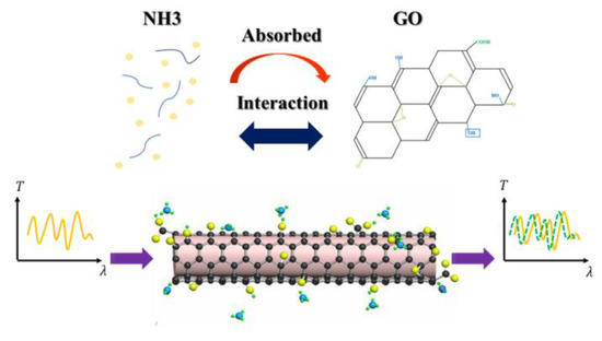 As a new type of two-dimensional nanomaterial, graphene has many unique and excellent properties [29,30,31,32] and has been widely used in the field of sensing [8,13,20,21,28]. Graphene oxide (GO) is an important graphene derivative, which inherits the properties of graphene, such as large specific surface area [29], and has excellent properties such as dispersibility, hydrophilicity and biocompatibility [32,33,34]. It should be noted that GO has a more attractive cost-effective and potential for large-scale production of graphene-based materials compared to graphene [35]. In addition, the surface of GO contains oxygen functional groups such as a hydroxyl group, an epoxy group, a carboxyl group and a carbonyl group [32,36], so that it can adsorbs gas molecules, and thus many studies have been proposed for gas sensing [22,23]. The absorption-related properties of graphene and graphene oxide on ammonia gas molecules have been studied [37,38], in which the results indicate that the GO showed highly distinguished selectivity towards NH3 in comparison with H2 and CH4 gases. The sensing mechanism of graphene materials is mainly due to its two-dimensional structure at the micro-nano level and its large surface area, which is very beneficial to the atomic or molecular level. In full contact, these contacts are essentially charge exchanges between molecules or atoms, which will change the local carrier concentration in the graphene material. Thus, a series of photoelectric properties of graphene such as electrical conductivity, optical frequency, effective dielectric constant and effective refractive index will change [21,39]. If the graphene material is combined with the optical waveguide, the two of them will form a hybrid waveguide, and once the graphene is affected by the external environment, the photoelectric properties of it will change, which will also profoundly affect the propagation field of the optical waveguide [20,40,41].