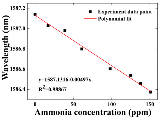 The relationship between wavelength shift and ammonia gas concentration is shown in Figure 11. The linear fitting results indicate a sensitivity of 4.97 pm/ppm with linear fit coefficient of 98.9% can be achieved in the range of 0–151 ppm ammonia gas concentration.