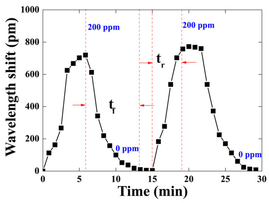 In order to investigate the reproducibility and reversibility of the proposed sensor, we repeatedly injected and extracted the ammonia gas with a concentration of 200 ppm into the gas chamber at a temperature of 25 °C. The transmission spectrum was recorded at intervals of 50 s to determine the dynamic behavior of the gas sensor. After the transmission spectrum reached a stable state, indicated when the wavelength of the interferometer minimum was no longer shifting, the next fill or discharge of ammonia gas took place. We recorded the wavelength shift of the resonant dip during two periods of ammonia gas fill and discharge, as shown in Figure 12. The results indicate that the dynamic response rising time (tr) and falling time (tf) of the sensor are about 5 and 7.5 min for the two periods, respectively. These repeated cycles of exposure to 0 and 200 ppm of NH3 gas demonstrate that the rising and falling time are not very fast, but the sensor exhibits good reversibility. The response and recovery time of the sensor are determined by the thickness of the GO layer, the diameter of the tapered fiber and the rate of ammonia gas mixing in the chamber on injection or expulsion.