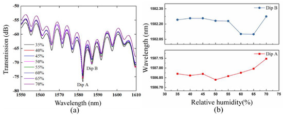 Humidity is a common environmental variable which can also cause transmission spectrum changes, so we have tested the humidity response characteristics of the sensor. The sensor was put into a constant temperature and humidity chamber (J-TOPH-22-B, Jiexin Testing Equipment Co., Ltd., Dongguan, China) with a relative humidity range from 35% to 70%, which basically covers the range of common relative humidity changes. The output transmission spectrum at different relative humidity with the ammonia gas concentration of 0 ppm is shown in Figure 13a. We can see that the wavelength and intensity of the resonant dip will vary when the relative humidity increases from 35% to 70%. GO films are highly hygroscopic due to the presence of oxygen-containing groups on the surface and edges of GO [18,34]. When the relative humidity of the environment increases, the GO film absorbs more water molecules. The water molecules will adhere to the surface of the GO or fill the GO layer, which causes the GO film to swell [25]. Thus, the refractive index of the GO film will decrease as the water molecules increase, and the refractive index difference between the GO film and the fiber cladding will be smaller. When light in the fiber passes through the cladding and reaches the interface between the cladding and the GO film, part of the light is reflected at the interface, and evanescent wave leakage is suppressed and reduced. As a result, the contrast ratio of the transmission spectrum decreases as the relative humidity increases.