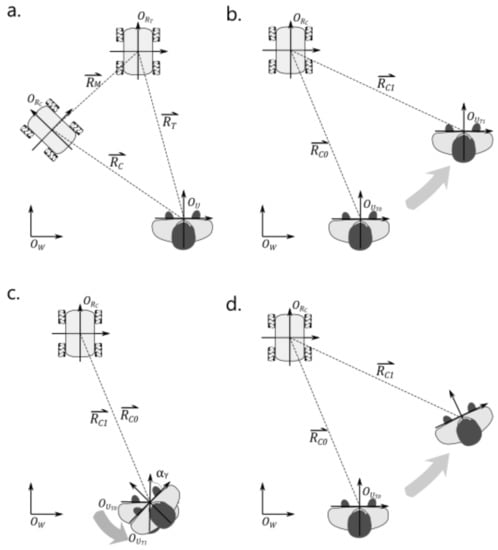 The first scenario is that the user performs a translation without rotation, as shown in Figure 1b. Assuming the user translates from to , let in the world coordinate system , and view the movement from the perspective of .