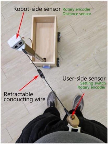 The key point of the proposal was determining the positions of the user and robot w.r.t to each other. We achieved this task using the novel “string-pot” sensor system. It is compact, reliable, and immune to environmental noise such as light. However, with this “string-pot” sensor system, the user-side sensor is not suitable to be worn on the lateral side of the user’s body because the sensor and wire will interfere with the user’s hand. To remove the wire, i.e., create a wireless system, further challenges must be overcome, such as target user identification and user orientation determination. Facial recognition [28] may solve part of this problem, but issues such as the user looking around without changing the body’s position while the robot is following behind must be considered. Obtaining the relative distances and orientations of the user and robot without physical wires is possible. Two inertial measurement units (IMUs) [18,19], mounted on both user side and robot side, and a laser range finder [20] can provide information on the distance and orientation between the robot and the user.