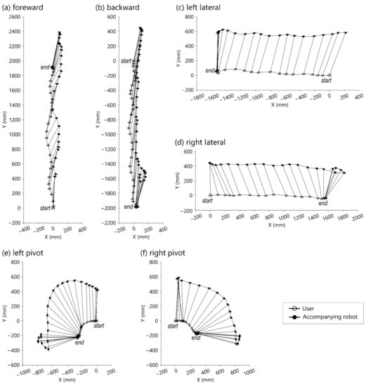 The results show that the robot can follow the user in the designated position while the user performs forward, backward, and lateral movements, turning, and curve walking. In other words, this study has demonstrated that with the proposed tracking strategy, the accompanying robot can closely follow the user in sideways or sharp turn movements. In addition, it can accompany the user in front even when the user moves backwards.