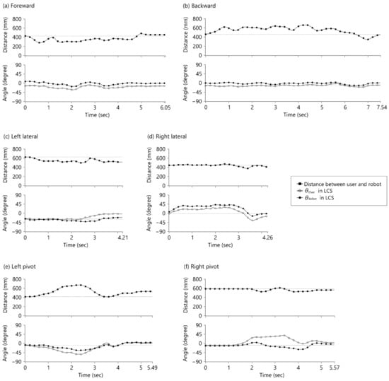 Figure 7 shows the time series of the sensing values for the walking tasks that correspond to the distance between the robot and the user and the encoder values , . The gaps between the set distance and actual distance and between and the target angle represent the lag and overshoot of the track. Lag tracking can be demonstrated in the increased gap between and . The distance between the user and the robot decreased while the user walked forward and increased while the user walked backward due to the phase lag.