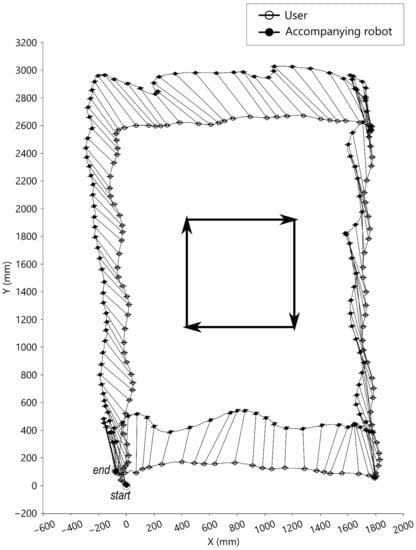 In the condition of walking along a rectangle, the user was instructed to walk along the rectangular force plate in the center of the motion lab. The movements along the rectangle in this condition included walking forward, laterally right, backward, and laterally left with eight steps per direction. The results are presented in Figure 8. The accompanying robot could follow the user walking along the rectangle. Shown are the trajectories of the walking tasks where the corresponding origins of (symbolized ‘○’) and (symbolized ‘●’) are linked by line segments. The protruding hairline symbols represent the medial-lateral directions.