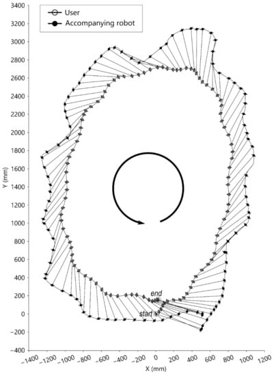 The excursion trajectories of the robot are greatly affected by the target position and user movement tracking. As shown in Figure 6e,f, the robot took a longer path while the user pivoted. Furthermore, as shown in Figure 9 and Figure 10, the user performed similar lengths of circular walks, but the robot trajectories were different. One of the robot’s trajectories was similar to the user’s trajectory, and the other of the robot’s trajectories was larger than the user’s trajectory. The reason was that one of the robot’s target positions was on the walking curve/circle, and the other was outside of the walking curve/circle. If the target point is outside of the instance center’s circle of the user’s moving curve, the robot is expected to take a longer path than the user.