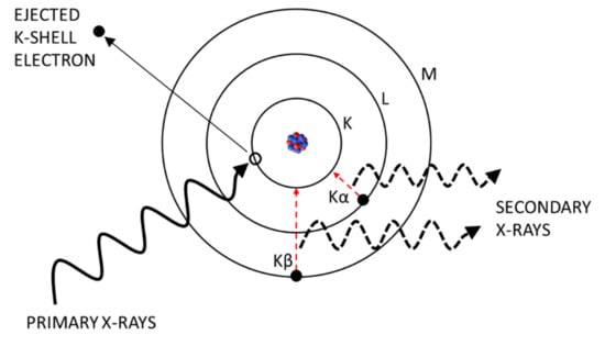 To produce XRF radiation, a sample is irradiated with high energy X-rays (called primary X-rays) in the wavelength range of 0.01–10 nm (equivalent to 125–0.125 keV). As a consequence, some atoms get ionized by ejecting an electron from one of the inner orbitals and an electron from one of the outer, higher energy orbitals fills the produced vacancy (Figure 1). Due to the transition to a lower energy state, the electron releases photons with an energy equal to the specific difference in energy of the two involved orbitals. This kind of radiation is called “secondary X-rays” or “X-ray fluorescence” [9]. It is unique to each element leading to characteristic emission spectra. By detecting the amount and frequency of the secondary radiation, the elementary composition of a sample can be qualitatively and quantitatively determined. The most pronounced emissions are generated by transitions from L to K shells (Kα) and from M to K shells (Kβ) of the atom [16]. On the one hand, the intensity of these fluorescence emissions depends on the energy of the incoming X-rays. In general, the lower the incident X-ray energy, the higher is the absorption cross section and the higher is the fluorescence intensity. However, if the X-ray energy is intensified approximating the binding energy of an inner electron, a strong increase in absorption cross section will be recognized slightly above the electron’s binding energy (K- or L-edge). On the other hand, the fluorescence intensity is reduced when secondary X-rays are either absorbed by an electron on their way out of the atom emitting another electron instead (called Auger-electron) [9], by air molecules, or window-materials on their way to the detector cell. In summary, the ratio of produced vacancies and emitted fluorescence photons is called fluorescence yield and increases with the atomic number of an element. This means that lighter elements (e.g., carbon or nitrogen) are more difficult or even impossible to be analysed depending on the XRF system. As WDXRF systems are more sensible than EDXRF systems, elements from beryllium (z = 4) to uranium (z = 92) can be detected [9], whereas EDXRF systems can only detect elements from sodium (z = 11) to uranium. Field portable XRF systems cannot analyse elements lighter than magnesium (z = 12) [17].