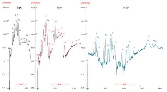X-ray fluorescence (XRF) spectrometry is a well-established technique to determine the elemental composition of specimens, e.g., in the metal working, glass and cement industry [9,10]. It is also used for the investigation of archaeological objects and artwork [11]. Several studies show that XRF spectrometry can be also utilized for characterizing samples of different environmental media such as rocks [12], soils [13], sediments [14] or plant materials [15].