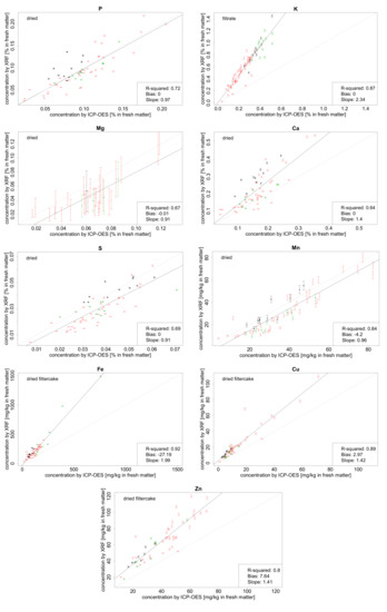 Table 2 summarizes the coefficients of determination for element concentrations obtained by ICP-OES and XRF depending on the four different sample preparation procedures. Best regressions for each element are additionally visualized later on in Figure 3. The regressions of Mg and Mn for liquid samples (original and filtrate) could not be calculated because most of the sample concentrations were below the instrument’s LOQ. In comparison to the liquid samples (original and filtrate), results for all elements (except K) of dried samples show a clear tendency of improving regression models due to drying. For example, the coefficient of determination for S in liquid samples (original and filtrate) was poor with 0.02 and 0.04. Dried samples (dried and dried filter residues) showed much better R2s of 0.69 and 0.66, respectively. In general, dried samples gave best results for most of the elements (Mg, P, S, Ca, Mn). For the heavier elements (Fe, Cu, Zn), dried filter residues samples had slightly better R2s than dried samples. As mentioned above, only potassium showed a better correlation in liquid samples with R2s of 0.83 and 0.87 for fresh samples and filtrates. One reason might be that potassium mainly exists as solved and hydrated K+ ions in the liquid phase, while all other target elements predominantly occur in the solid phase of the liquid fertilizer [30].