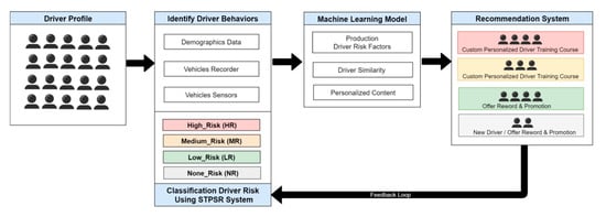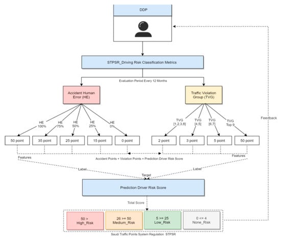 - The driver behaviors risk analysis process uses rule-based classification, the risk matrix classifies the parameters using the Saudi Traffic Points System Regulation (STPSR). The rules for deciding the number of points calculated for every violation/accident of traffic regulation risk likelihood are divided into 4 risk score levels, which are high, medium, low risk, and no risk drivers, determined based on driver historical violation/accident records to predict current and future driver risk scores using the STPSR system. To predict the driver’s risk score we used this equation: human errors (HE) + violation group (VG) = prediction driver risk score (PDRS) during a 12 month period, as shown in Table 1.