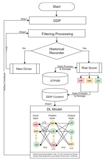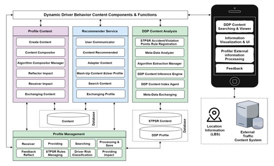 - Maintaining a single profile for the user preserves a consistent experience by giving the user an intuitive management system which is allowed by the profile management and feedback processing. Exchanging and managing refer to extracting driver risk behavior and user profile elements by analyzing profile contents, and then linking them with data storage. The content manager also automatically constructs contents generated by the STPSR index violation/accident, the DDP element analysis management, and the general effect/efficacy information of the driver risk behavior, and then stores them in the database. The effect of the information is generated from the feedback of the user and the profile information reflecting information stored in the profile databased. However, the first priority of this paper is to enhance the quality of road safety for the individual in the field of intelligent traffic recommendation services, which can be done by integrating the user and vehicle information, violation and accident records, and driver habits into integrated customized contents, which in turn requires hybrid learning recommendation processing [21].