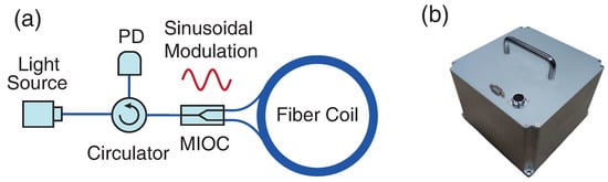 (a) Schematic diagram of the IFOGs adopted in the RotSensor3C; (b) picture of the RotSensor3C.