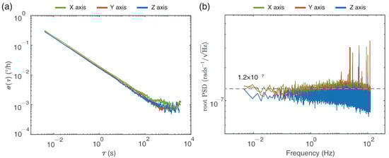 (a) Allan deviation curves and (b) root power spectral density of the rotation sensors.