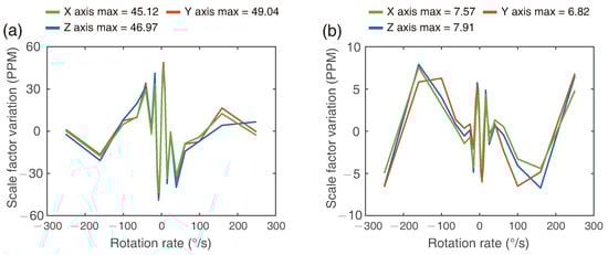 (a) Scale factor variation with input rotation rate before linearity compensation and (b) after linearity compensation.