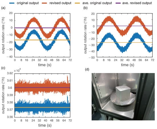The results with misalignment matrix to compensate the cross-coupling errors are shown in Figure 4. The latitude of our laboratory is 39.991844 so the local corresponding vertical rotation rate of earth is . As the RotSensor3C is placed with z axis vertically and the table rotation rate is , the output of z axis should be 36,009.6 (added the local earth rotation rate). The outputs are related to the respective angles between the sensor axis and north–south (NS) direction, which can be expressed as: