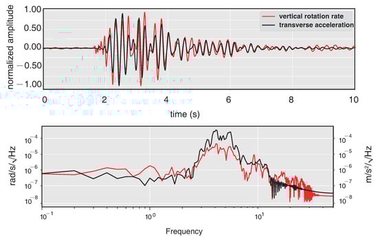 Normalized amplitude and spectra of vrtical rotation rate and transverse acceleration after band-pass filtered.