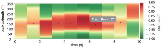 The six-component measurement provides a new method to estimate the additional information of seismic waves, such as back-azimuths (BAz) and phase velocity. Here we use the rotational seismology tools of a community platform (www.seismo-live.org, accessed on 1 March 2021) to process the vertical rotation (Rv) and two acceleration components EW (Ae) and NS (An). Firstly, all the components are band-pass filtered between 0.1 and 10 Hz, as this frequency band of the near-field earthquake is what we concerned. Then the two translation components Ae and An are rotated into the transverse component (At) based on a trial BAz and calculate the cross-correlation of At and Rv. Since At and Rv are both result from the same ground motion, they will reach a maximum cross-correlation when the trial BAz coincides with the true one []. The normalized amplitude and spectra of transverse acceleration rotated by an appropriate BAz and vertical rotation are shown in Figure 8, in which the normalized amplitude over time show a strong correlation of them. Moreover, according to the PSD analysis in Figure 8, both background noise and the signal spectrum appear to be highly correlated with each other. A time step of 1s is applied to continuously estimate BAzs and CC along the whole 10s seismogram. Figure 9 shows the whole BAzs indicated by the black dots of each time window, which is consistent with the theoretical BAz (∼157) shown with the gray line. Figure 10 shows the correlation coefficients of each sliding time window, as the seismic signals mainly distribute in 2∼7 s, the correlation coefficients > 0.75 focus on the same time parts.