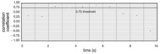 Cross-correlation coefficients between the transverse acceleration and rotation rate computed for a sliding time window.