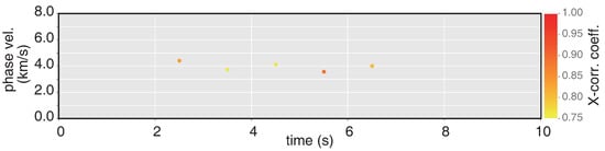 Phase velocity of SH-type waves for 1s time step with correlation coefficients > 0.75.