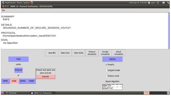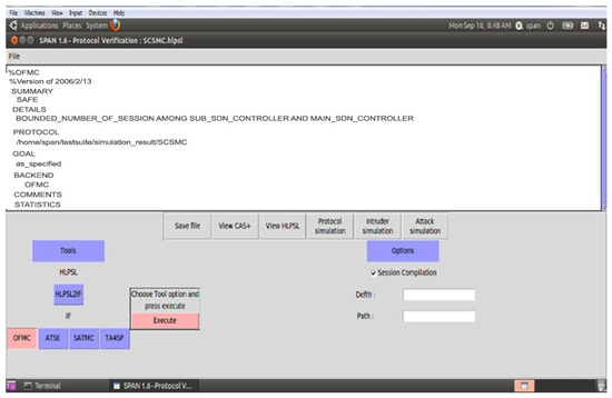 The section contributes to secure the identified threat vectors and their vulnerabilities. We validate our proposed security scheme using a familiar simulation tool called AVISPA [24,25]. In AVISPA, the user can interact with a tool to identify the security problems to validate/verify and check the Internet’s sensitive security module and different cryptography techniques. It ensures that the proposed security model is SAFE/UNSAFE to code it into HLPSL. It is then converted to machine language by using the intermediate format. The prosed model has four modules, e.g., OFMC, CL-AtSe, TA4SP, and SAT-based module checker, to identify results. AVISPA simulation tool architecture is shown in Figure 10. The proposed SDVN architecture is secured using the PKI-based digital signature model for secure data transmission between V2V, public key authority infrastructure used for V2I, and a three-way handshake method to secure data transmission, SDN controllers.