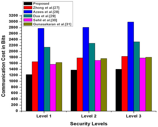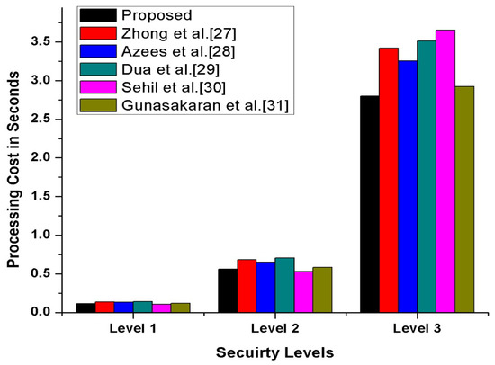 In this section, we have compared our proposed scheme with other state-of-the-art schemes [27,28,29,30,31] in terms of transmission, processing cost, and the number of messages exchanges during transmission. Furthermore, to compute our proposed scheme’s operational cost, we have counted the major and costly operations. The costly operations are exponentiation, scalar multiplication, and bi-liner pairing, while the minor operations included hash function, addition, XoR, and subtraction, which is considered negligible. The experimental hardware specifications are ASUS Z-Book with an Intel R Core TM i3-6100 U CPU GHz and 8 GB memory running on 64-bit Windows . According to [32], the per unit cost of scalar multiplication is ms, and the per-unit cost of exponentiation is ms while one bilinear pair is ms. Therefore, we have calculated our proposed and other existing [27,28,29,30,31] schemes’ operational comparative cost analysis. The detailed comparative cost analysis is reflected in Table 3. According to Gunasakaran et al. [31], ECC multiplication, hash, symmetric encryption, and decryption are ms, ms, and ms. Therefore, as per these stated several unit operations, our proposed scheme, mutual authentication, consumes seconds, which is also reflected in Figure 13. Additionally, we assumed that the vehicle identity bits, timestamp bits, location bits and hash is 256 bits. Thus, as per this assumption, in our proposed scheme for authentication process, along with confidential transmission of vehicles, messages consumed bits, bits, bits, respectively, also shown in Figure 14. Therefore, in messages, transmission consumed a total of 1226 bits cost. Moreover, in our proposed scheme, we have maintained the tradeoff between security and cost to protect the SDVN information during transmission on public networks from adversaries’ attacks by utilizing minimal cost.
