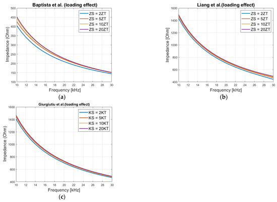For analyzing this effect graphically (theoretical), first at areas where no resonant peaks exist, the loading KS (ZS) is increased from 2KT (ZT) to 20KT (ZT). To calculate the modulus of the impedance, a frequency range of 10 kHz to 30 kHz, and a patch size of 20 mm × 20 mm × 0.5 mm is considered. The same method is performed for Liang and Baptista et al.’s models and plotted as shown in Figure 2. The patch parameters can be found in Table 1 for Giurgiutiu et al.’s model, for Liang and Baptista et al. models in [23] and [25] respectively.