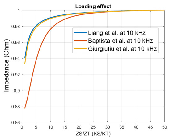 It is seen that the impedance (modulus) value increases with increased loading. At higher loadings, the changes that can be observed become smaller. This counts for all three models meaning that the electrical impedance can vary between two values, minimum and maximum, depending on the size of the host structure. The minimum impedance is when there is no host structure, so KS (ZS) is zero. The maximum impedance is achieved when KS (ZS) is much larger than KT (ZT), as for large structures.