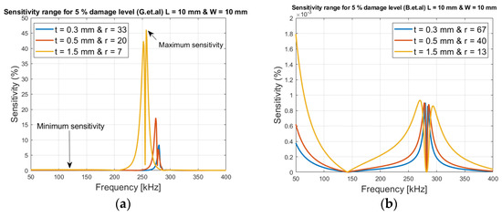 Sensitivity levels with respect to thickness variations (a) Giurgiutiu’s et al.’s model (b) Baptista et al. model.