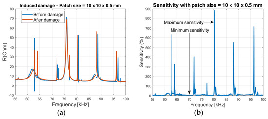 To investigate sensitive frequency areas, the same exercise as Baptista et al. [30] is performed. However, here, we use Giurgiutiu et al.’s model since this model includes a resonant term. A 5% variation (∆) in the mechanical stiffness ratio as (1 + ∆)r, see Equation (7), is assumed. Due to a hypothetical damage on the host structure, the percentage variation η of the electrical impedance before and after damage is calculated as: