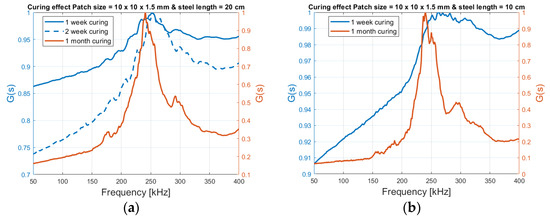 Curing effect on the admittance signature. (a) 20 cm long steel beam embedded in concrete with Patch size = 10 × 10 × 1.5 mm; (b) 10 cm long steel beam embedded in concrete with Patch size = 10 × 10 × 1.5 mm.