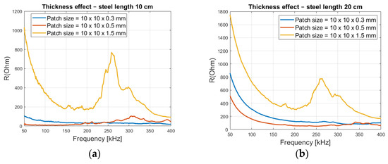 Figure 10 shows measurements of the real part of the impedance over a frequency from 50 kHz to 400 kHz, great dynamic activities in the region are seen for both the steel lengths and the patch thicknesses. Regarding magnitude, the difference between the patch size thickness of 0.3 and 0.5 mm is on similar scale, but an increase to 1.5 mm shows significantly higher magnitudes for both steel lengths. It should be noted that an increase in patch thickness also has the effect of decreasing the capacitance of the patch (see Equation (9)), which means higher impedance values.