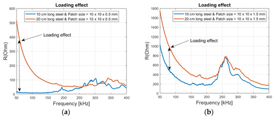 If the analysis is done at regions where resonant frequencies exist, using a patch size of 20 mm × 20 mm × 0.5 mm, and the loading increases as shown in Figure 5a, higher loadings cause a rightward shift, and the amplitude decreases. This effect can also be observed in Liang’s model (see Equation (4)) if the stiffness parameter increases.