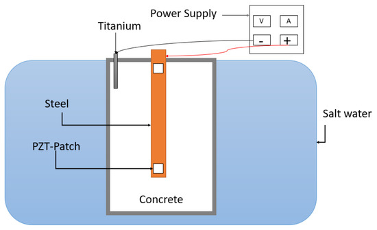 To investigate the sensitivity of the chosen patch sizes of 10 × 10 × 0.5 mm, placed at the top, and 10 × 10 × 1.5 mm patch placed at the bottom of the concrete as shown in Figure 16. 0.3 mm is disregarded because of its flat impedance spectrum. Only the 20 cm long steel rod embedded in concrete is corroded. An accelerated corrosion process by using the impressed current technique [19] was performed until visible amounts of corrosion resulting in cracks were obtained. As seen in Figure 16, the corrosion can be seen on the exposed part of the steel, where up to 5 mm of metal loss was measured.