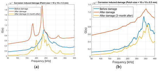 From Figure 18a, with the 1.5 mm thick patch, it is clearly seen that the (admittance) signature changes after the corrosion process. The main peak is shifted leftward from 240 kHz to 229.6 kHz and increases in magnitude, while two new peaks are created; one at 180.8 kHz and a smaller one at 315 kHz (red graph). These changes are likely due to the stiffness loss, decreasing the loading ratio r, resulting in a leftward shift of the main peak, as shown in Figure 5a. According to [33], when damage has reached a critical level, new peaks in the spectrum appears, this is consistency with the results observed here.